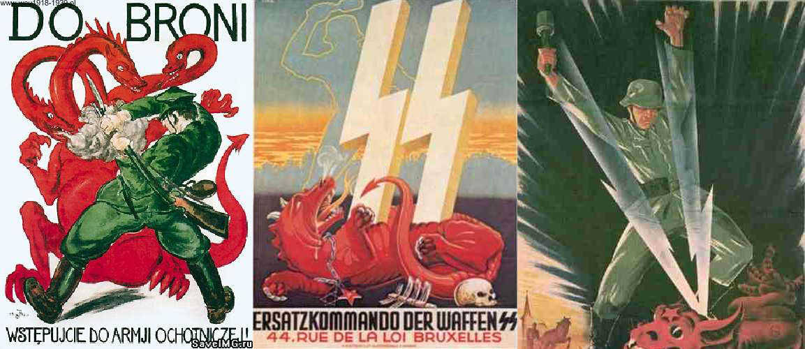 Слева польский плакат, справа немецкие. Образный ряд один и тот же.