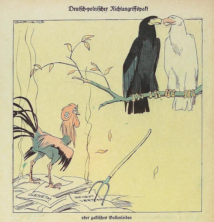 Немецкий сатирический политический журнал «Кладдерадатш». Карикатура от 10 декабря 1933 года. Надпись вверху: «Германо-польский пакт о ненападении», внизу: «или галльское излияние желчи».