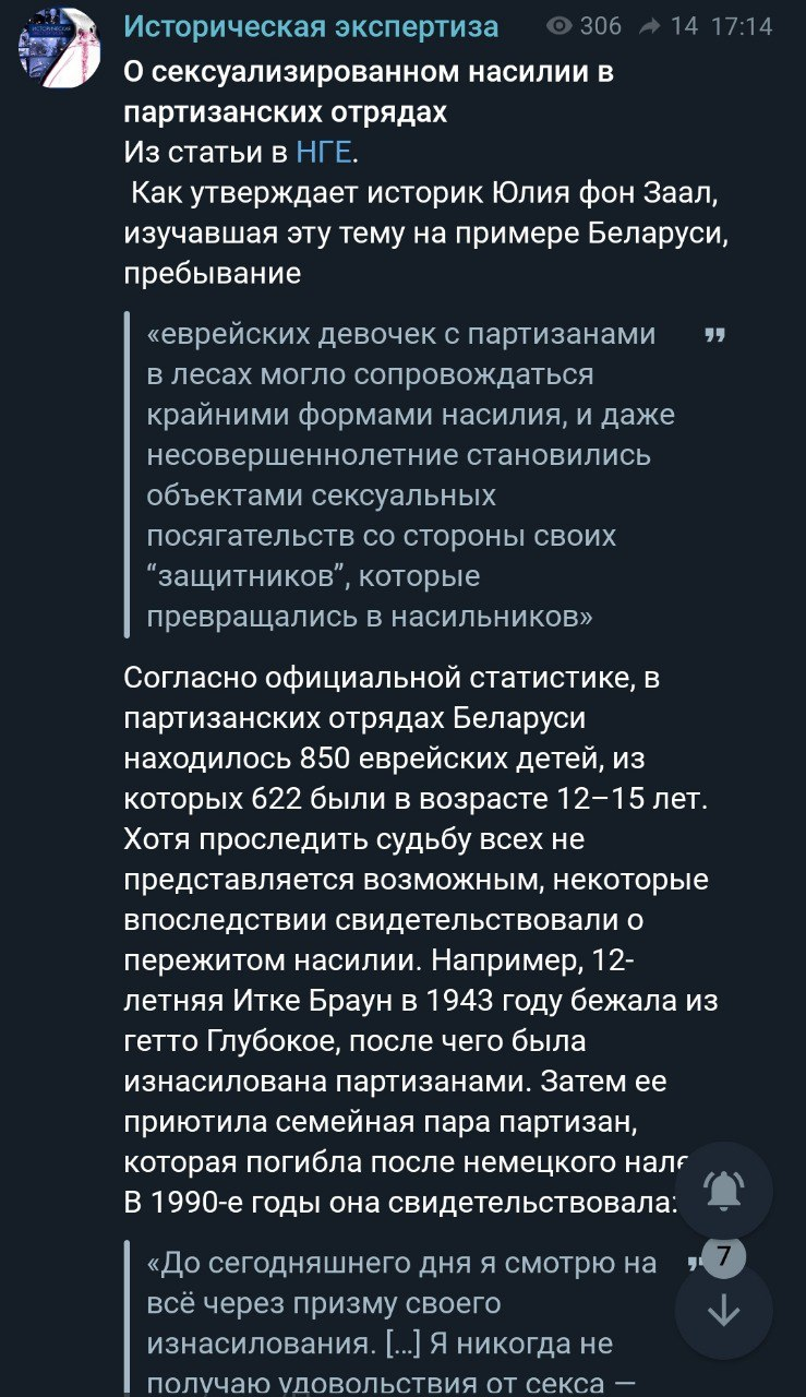 "Как утверждает историк Юлия фон Заал, изучавшая эту тему на примере Беларуси, пребывание «еврейских девочек с партизанами »» в лесах могло сопровождаться крайними формами насилия, и даже несовершеннолетние становились объектами сексуальных посягательств со стороны своих "защитников", которые