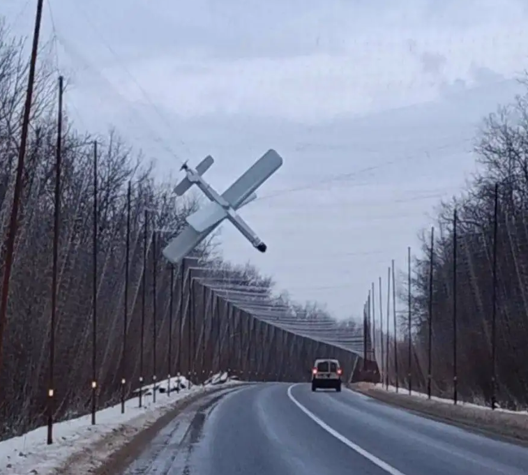 На кадрах видно, как сначала падает часть металлических столбов, после чего остальные конструкции начинают рушиться по цепной реакции. Это произошло из-за того, что сетка, предназначенная для защиты дороги от ударов легких беспилотников, была натянута слишком сильно, а вес обрушившихся конструкций спровоцировал дальнейшее падение опор.