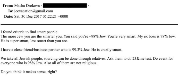 Я нашла критерий, как находить умных людей. Чем больше в тебе еврейского происхождения, тем ты умнее. Ты говорил, что ты примерно на 98% еврей. Ты очень умный. Мой бывший начальник — на 78% еврей. Он суперумный, хотя и не такой умный, как ты. У меня есть близкий друг/бизнес‑партнёр — он на 99,3% еврей. Он невероятно умный. Берём только евреев; искать можно через родственников. Попроси их сделать тест 23andMe. Сделай мероприятие для всех, кто на 98% еврей. И ещё: все они нерелигиозные. Как думаешь, в этом есть смысл, правда?