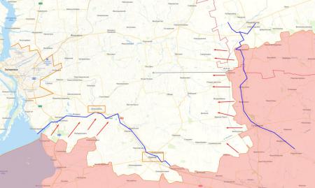 - Красными стрелочками я обозначил основные направления усилий ГВ «Восток» (справа) и ГВ «Днепр» (слева снизу) в данный момент.