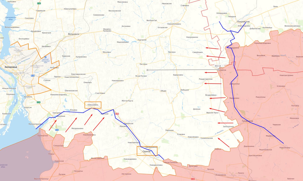 Направление на Камышеваху - нам снабжаться сложно, дорог мало. От Гуляйполя полегче - есть пути. Но вообще мне с дивана видится важнее - Покровское - Новониколаевка и большой Ореховский мешок с одной дорогой.