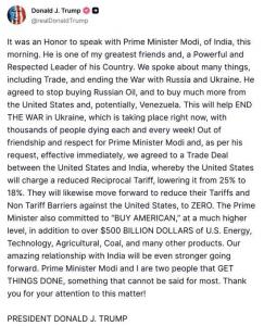Было честью пообщаться с премьер-министром Индии Моди сегодня утром. Он один из моих самых близких друзей и влиятельный, уважаемый лидер своей страны. Мы обсудили многие вопросы, включая торговлю и прекращение войны с Россией и Украиной. Он согласился прекратить покупку российской нефти и закупать гораздо больше у США и, возможно, Венесуэлы.