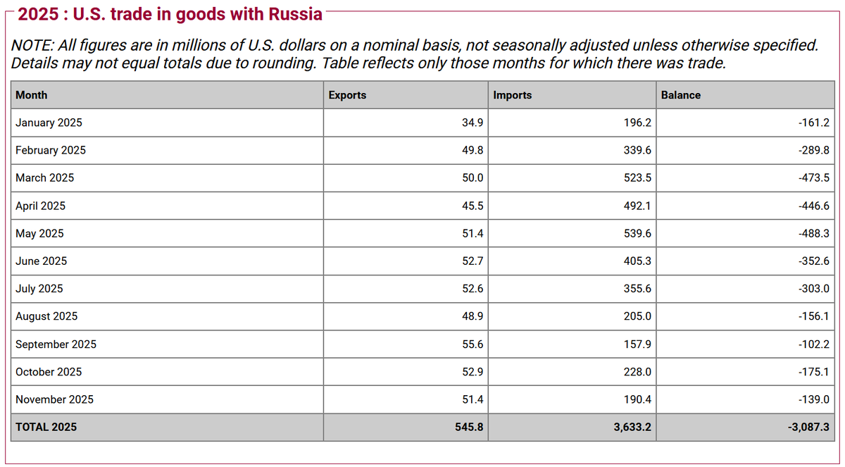 Если экспорт из США в РФ в целом стабилен и крутится вокруг цифры 52 млн $, то импорт из РФ в США, который в мае 2025 достиг уровня 539,6 млн $, упал в ноябре до 190,4 млн. Общий баланс торговли 139 млн $ в нашу пользу.