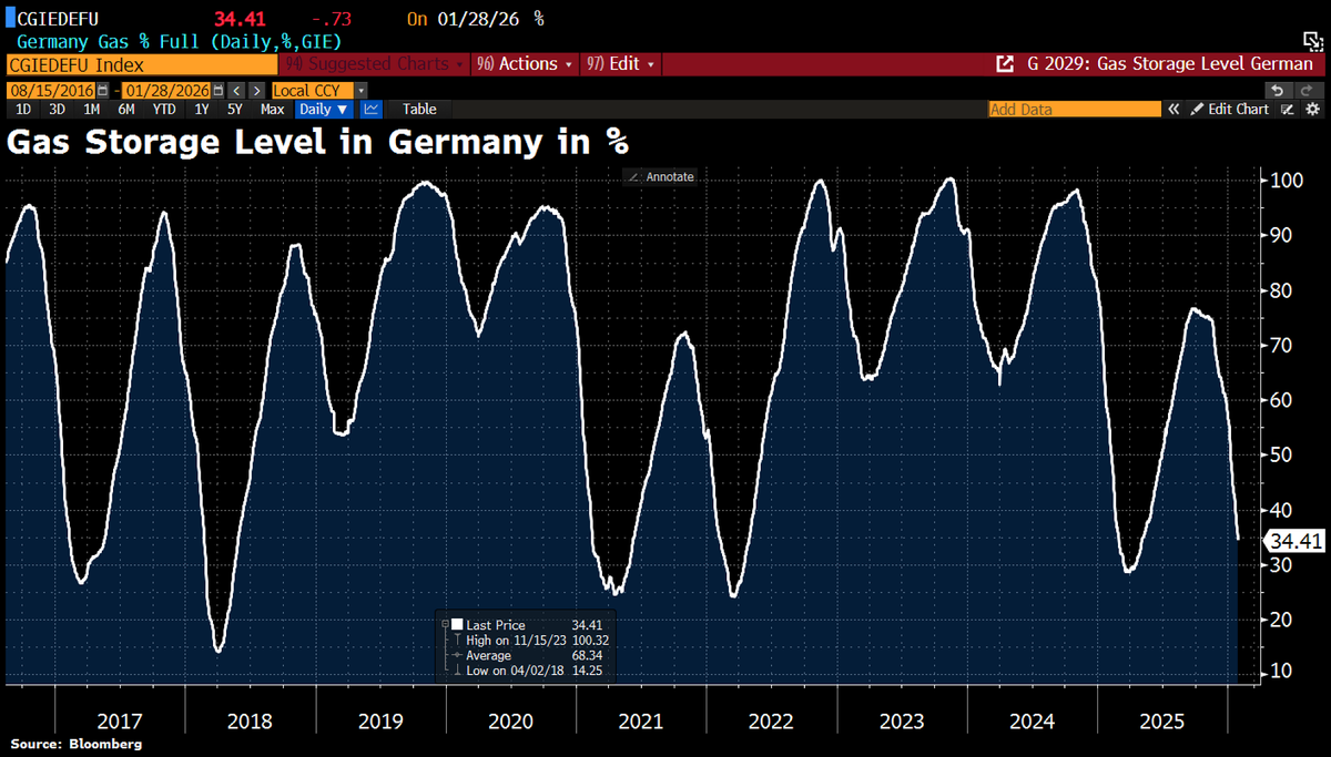 34,4%. Это новый рекордно низкий показатель для этого времени года – обычно уровень запасов значительно превышает 50%. Средний европейский показатель – чуть менее 43%.