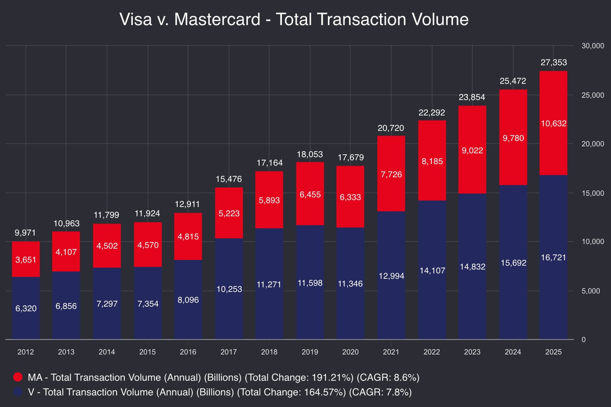 Общий объём транзакций двух самых известных мировых платёжных систем в 2025 году составил 27,35 трлн $