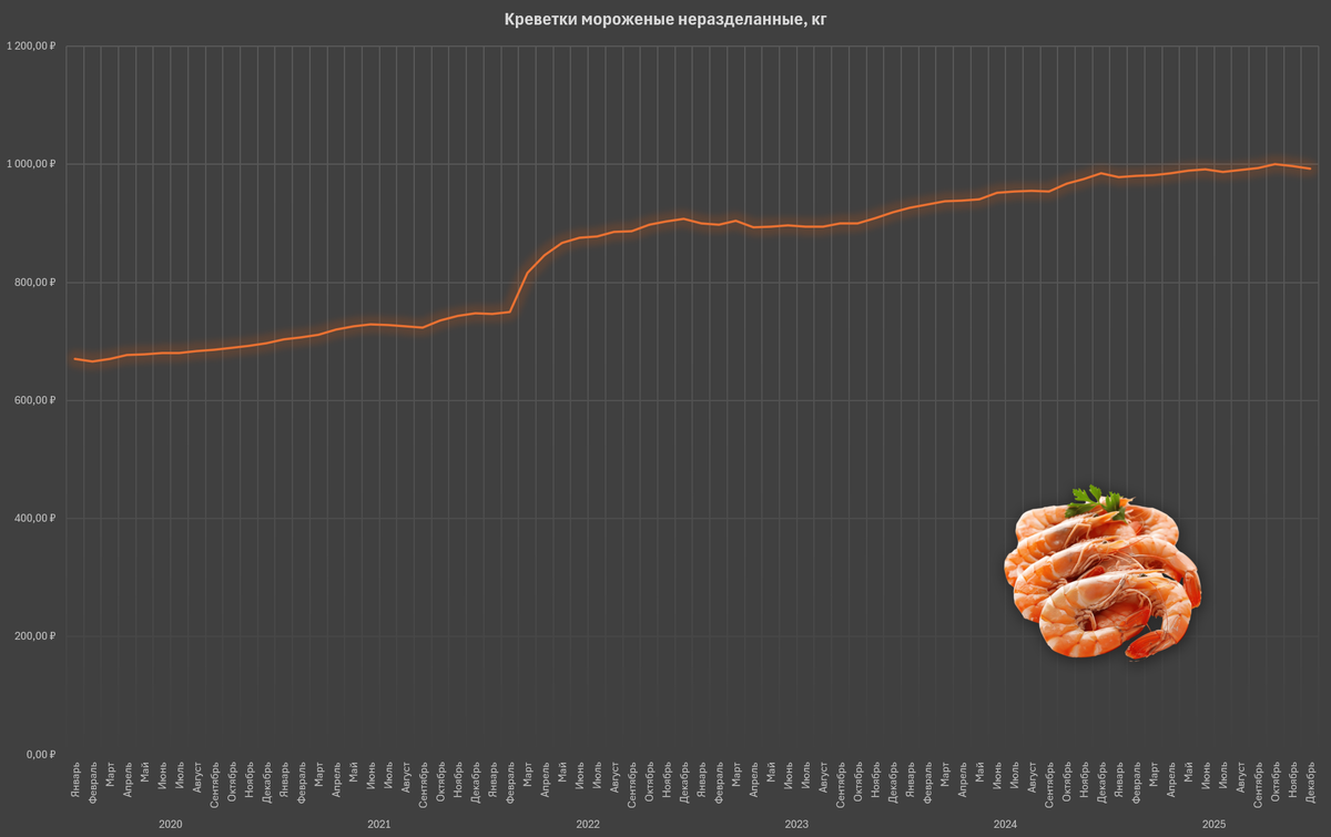 Итак, креветки мороженые неразделанные выросли в цене с 669,97 руб./кг до 993,22 руб./кг. Или на 48%. Ну что ж.