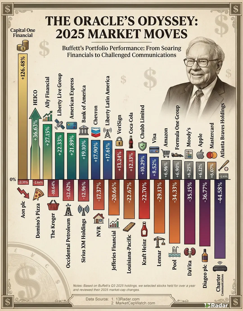 Если вы думаете, что чего не коснётся Варрен, всё немедленно начинает расти, то нет. На данной картинке показаны изменения рыночной капитализации за 2025 год компаний, акции которых по состоянию на конец 3 квартала 2025 года имелись в портфеле известного инвестора. При этом находились они там больше года.