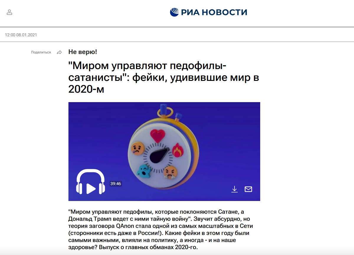 "Миром управляют педофилы, которые поклоняются Сатане, а Дональд Трамп ведет с ними тайную войну". Звучит абсурдно, но теория заговора QAnon стала одной из самых масштабных в Сети (сторонники есть даже в России!). Какие фейки в этом году были самыми важными, влияли на политику, а иногда - и на наше здоровье? Выпуск о главных обманах 2020-го.