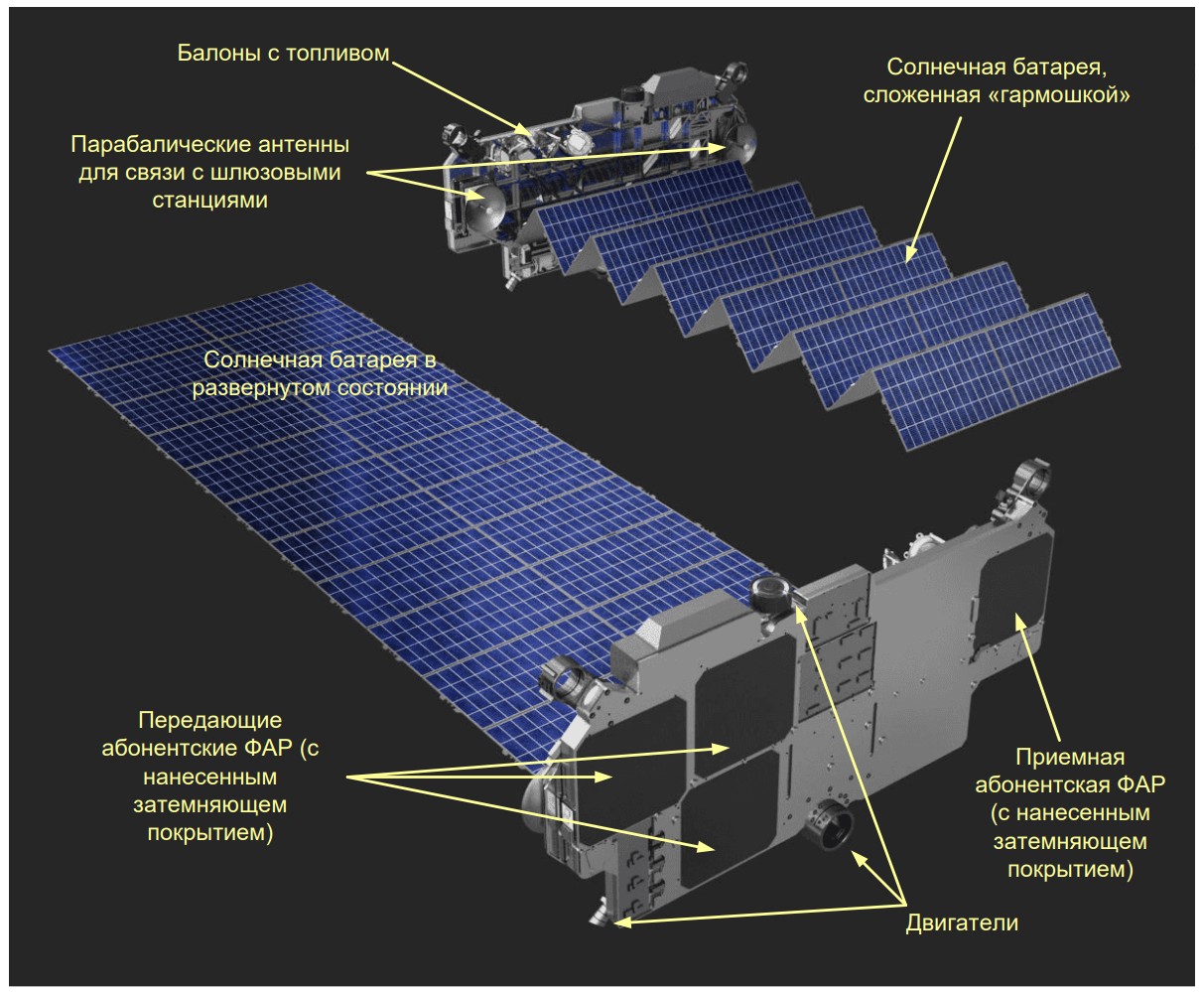 Далее будет кстати рассмотреть условную компоновку каждого отдельного спутника (КА) и про это скриншот ниже. Сложенная гармошкой солнечная батарея раскрывается и в данной версии показано три абонентские Фазированные Антенные Решетки (ФАР), работающие на раздачу сигнала и обслуживание ячеек плюс еще одна ФАР на прием. Отдельно нужно обратить внимание на параболические антенны, предназначенные для связи спутника с Шлюзовыми Станциями (ШС).