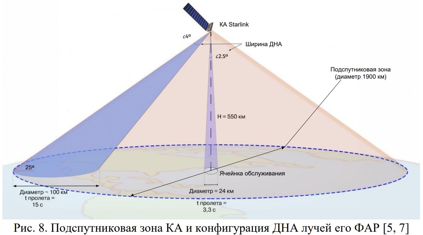 Более развернуто это выглядит так, как на скрине ниже: примерное положение самого короткого абонентского желтого луча в центре соответствует высоте спутника в 550 км и нахождению его строго в зените. В таком положении покрывается диаметр в 24 км на Земле (площадь 379,6 км2) и в таком случае предполагается возможность обслуживания 125-130 АТ. Как хорошо видно, зеленый луч, находящийся с правого края подспутниковой зоны покрывает гораздо больший диаметр 70-100 км. Полагаю, с учетом расположения ничего дополнительно с такой разницей (24 и 100 км) объяснять не требуется.