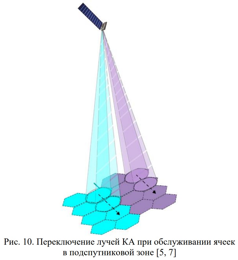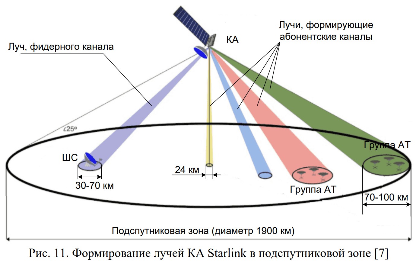 Отдельно слева сиреневым цветом показан луч фидерного канала связи с наземной ШС, который осуществляется через те самые параболические антенны на спутнике.