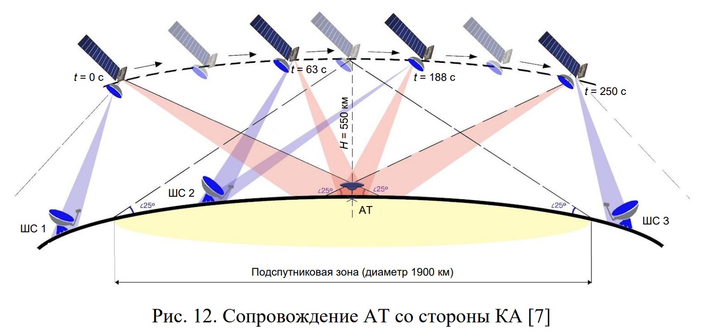 Общее время пролета подспутниковой зоны для каждого Космического Аппарата всего 250 секунд. И для условного случая обслуживания всего одного АТ - скриншот ниже. Глядя на него, можно примерно понять, как осуществляется переключение спутника на связь с более удобными ШС и на разные формирующие углы луча при сопровождении АТ во время пролета.