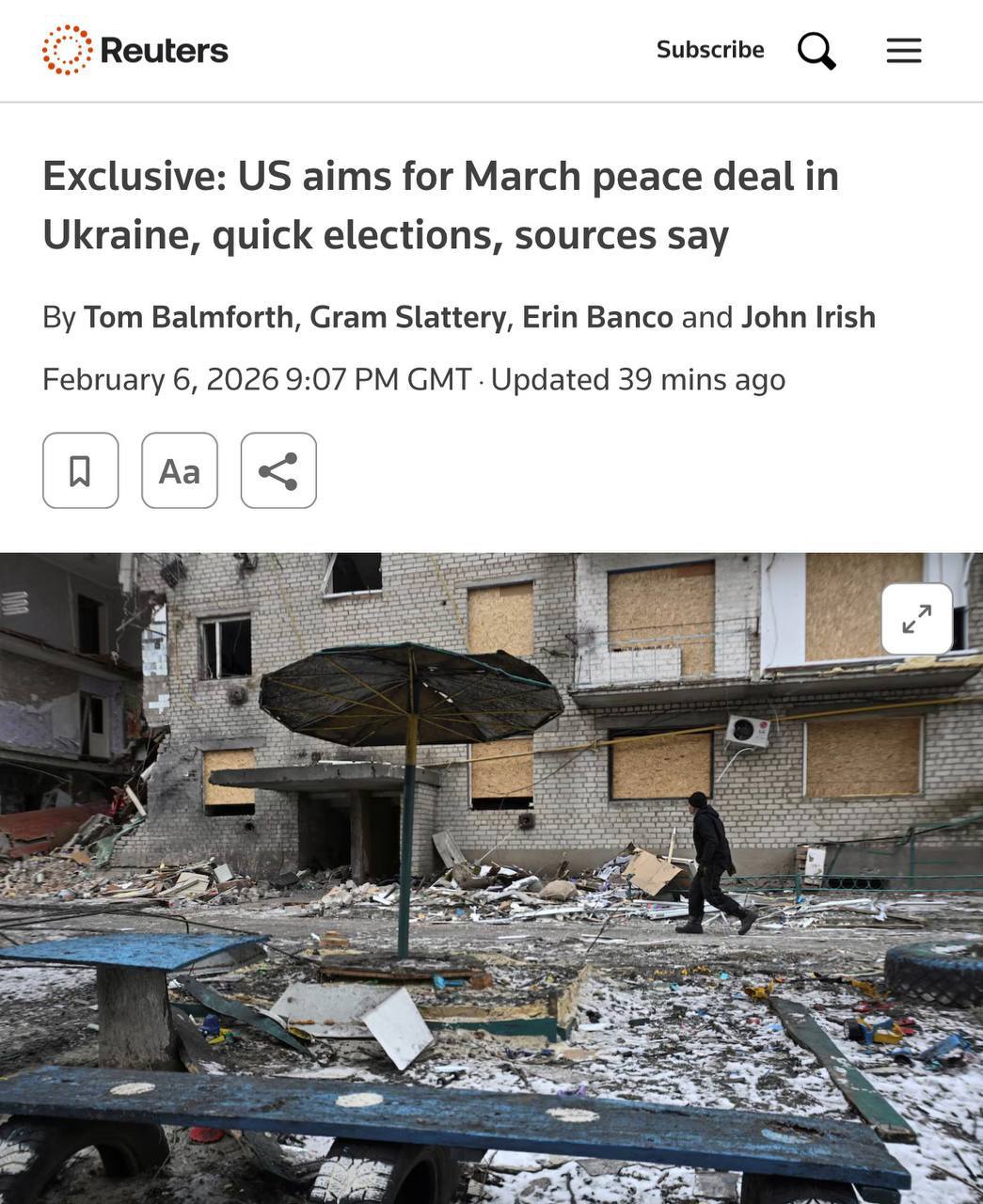 Эксклюзив Reuters: По словам трёх источников, знакомых с ситуацией, представители США и Украины на переговорах обсудили амбициозную цель — заключить мирное соглашение между Россией и Украиной в марте, хотя этот срок, скорее всего, сдвинется из-за отсутствия согласия по ключевому вопросу — территориальному.