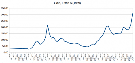 С момента отвязки цены доллара от золота в 1971 году, мы имеем всего три долгосрочных тренда: бурный рост (1971-1980) с коррекцией в 1974-76 годах, снижение (1980-2001) и новый рост (2001-2025), где можно также выделить коррекцию 2012-2015 года. При этом, событием 2025 года можно считать пробитие долгосрочного сопротивления на уровне ~220 постоянных долларов.