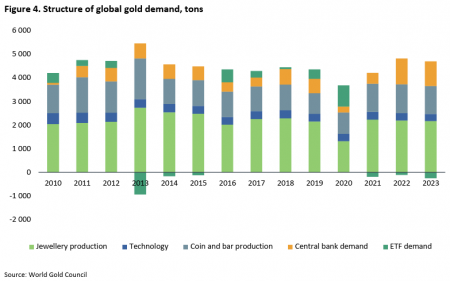 Из основных компонентов спроса относительно стабилен спрос со стороны электронной промышленности. Спрос со стороны ювелирки упал на четверть, со стороны ЦБ - на ~20% (с учетом монет - больше). Весь прирост драйвит мелкий розничный (ETF) и средне-крупный (слитки) инвестор.