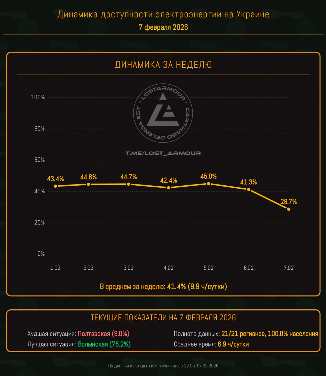 Среднее время доступности электроэнергии за сутки - 6,9 часов (28,7%) - самый низкий показатель с начала 2026 года.