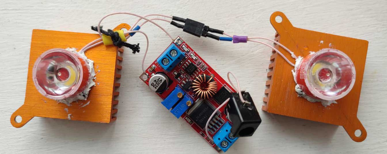 На паре радиаторов от видеокарт и двумя трехваттными светодиодами. (Настройки выкручены на стабильный ток чуть менее 1 ампера.)