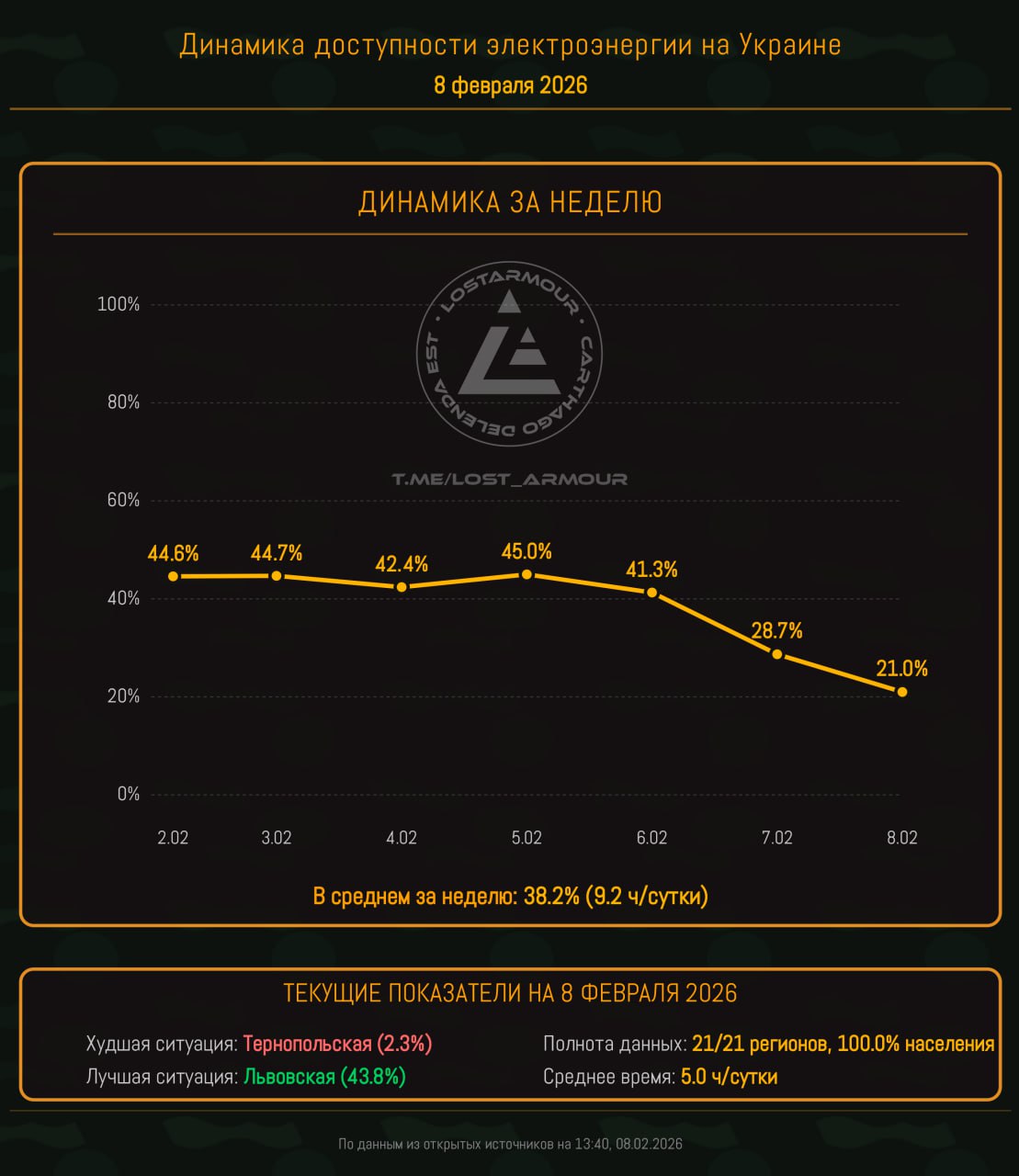 Среднее время доступности электроэнергии за сутки - 6,9 часов (28,7%) - самый низкий показатель с начала 2026 года!
