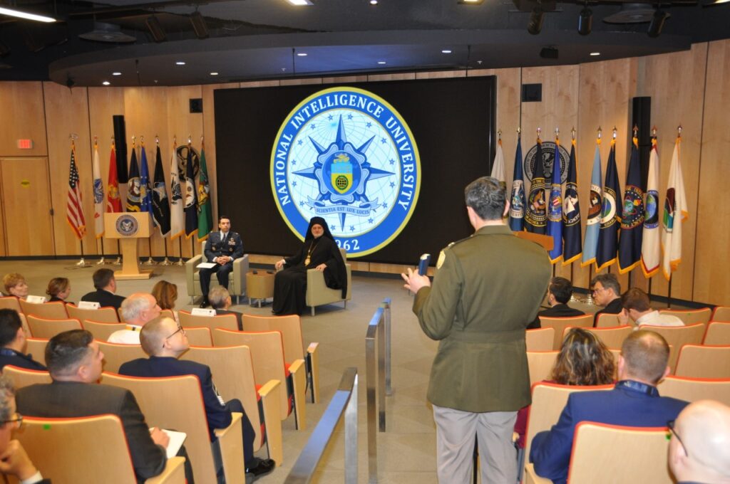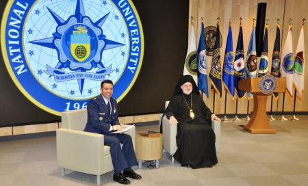 Архиепископ Элпидофорос с модератором мероприятия, доктором Джейком Сотириадисом, директором Исследовательского центра перспективной разведки Национального университета Иллинойса и старшим офицером разведки ВВС. (Фото: Предоставлено Национальным университетом разведки)