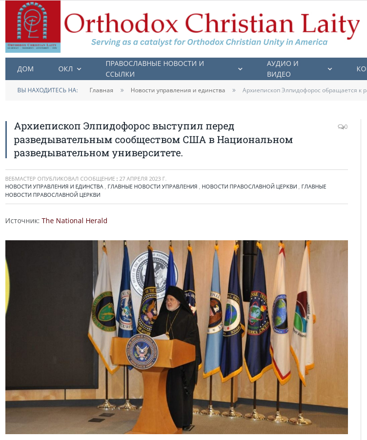 "Его Высокопреосвященство архиепископ Элпидофорос был почетным гостем на серии президентских лекций Национального разведывательного университета, где он выступил перед преподавателями и студентами на тему «Использование Россией религии в качестве оружия в украинском конфликте». Этот исторический визит стал первым в истории выступлением духовного лидера Греческой православной архиепархии Америки перед разведывательным сообществом США. Национальный разведывательный университет (НИУ) — это ведущее академическое учреждение разведывательного сообщества США, в котором работают преподаватели и студенты из всех 18 разведывательных ведомств (включая ЦРУ, АНБ, АНБ, ФБР и другие), а также из всех родов войск вооруженных сил США.