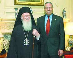 Патриарх Константинопольского патриархата Варфоломей с Коллином Пауллом, который тряс поддельным пузырьком ради вторжения в Ирак, после чего там в том числе стали исчезать христианские общины и появился ИГИЛ,