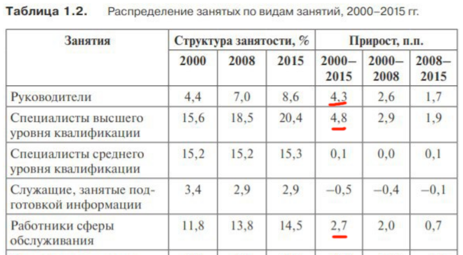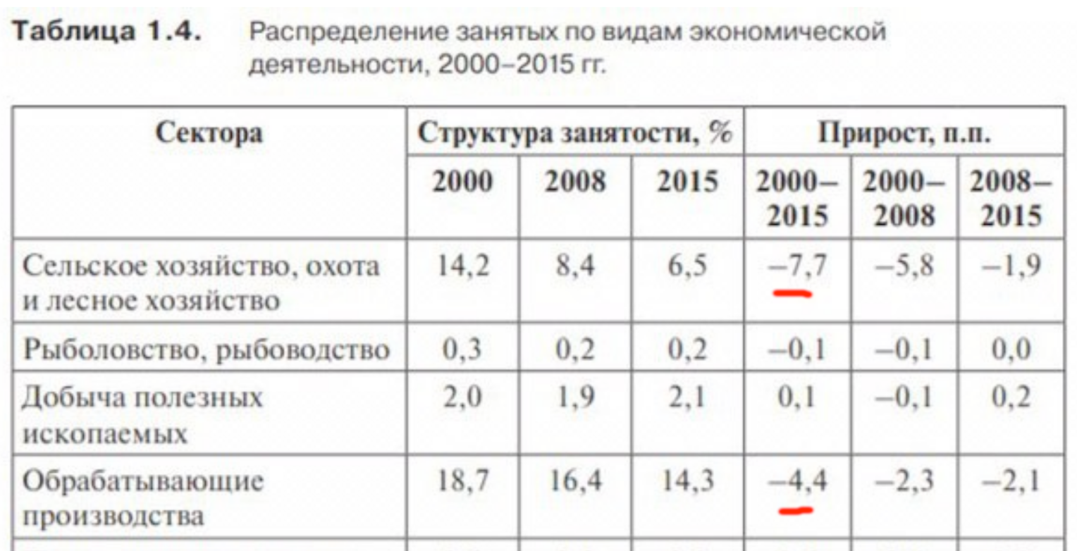 Это подборка различной информации о нашем рынке труда. Нас в ней будет интересовать «2000-2015: Динамика структуры занятости», там есть две волшебные таблички, здесь они приведены в сокращенном виде: