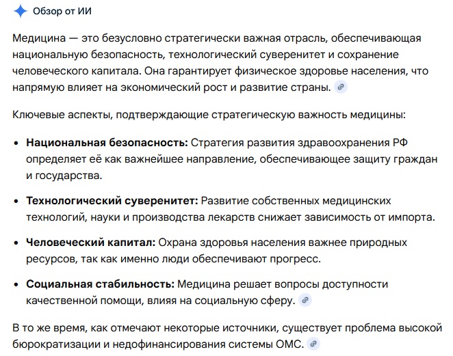 "Медицина — безусловно стратегически важная, ключевая отрасль для любого государства, так как она напрямую обеспечивает национальную безопасность, сохраняя здоровье и работоспособность населения."