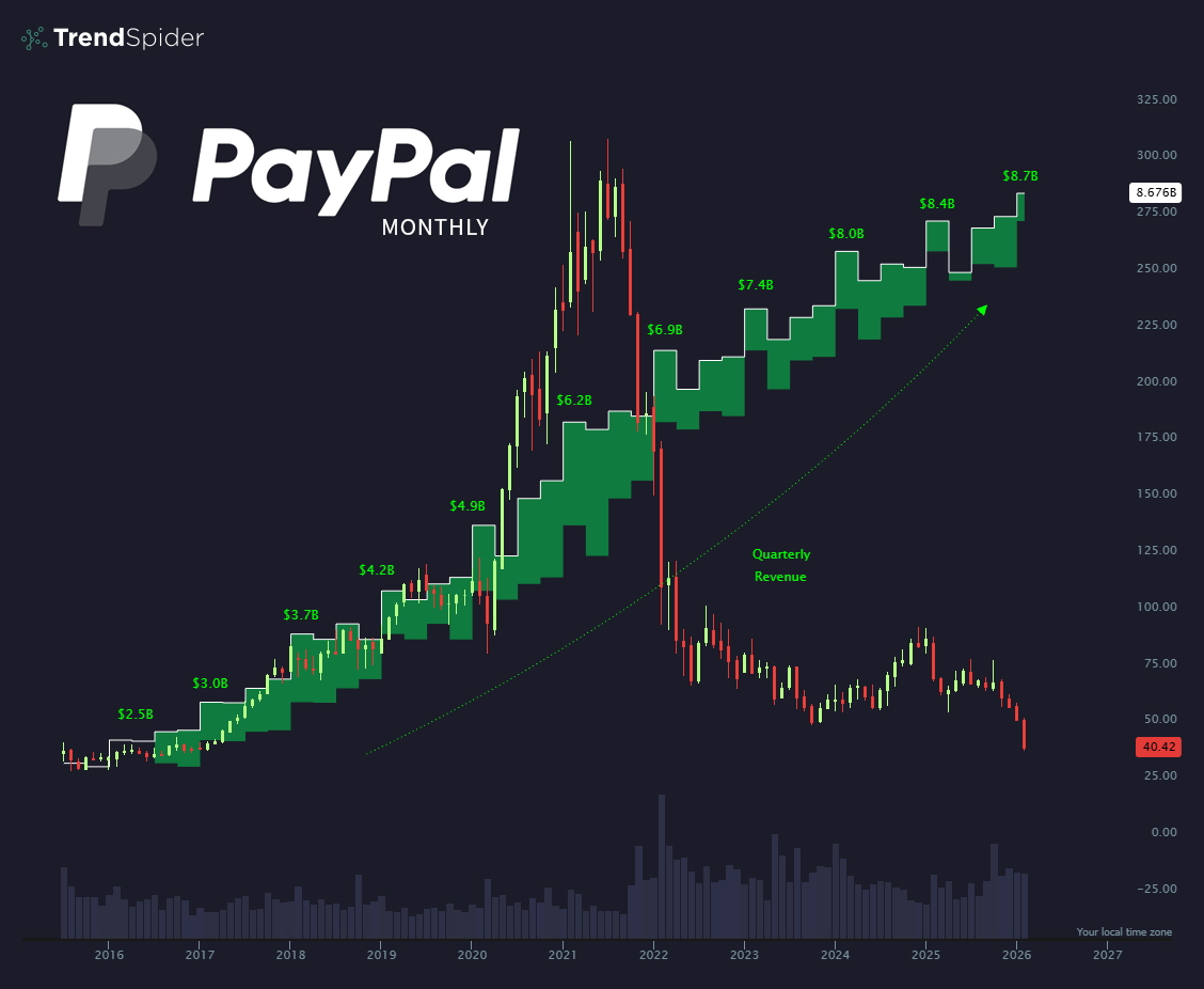 В очередной раз на примере PayPal показываю, что хорошие фундаментальные показатели не всегда равно хорошая капитализация. Постоянные читатели канала уже видели эту штуку с PayPal, но время течёт, приходят новые данные, а ситуация не меняется.
