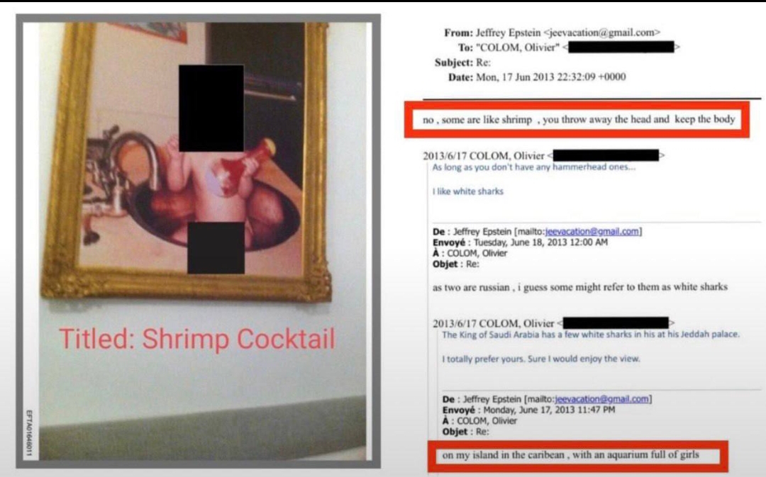 В слитых документах Эпштейн открыто заявляет, что любит есть мясо младенцев. Особенно ему и его гостям нравится мясо русских детей, их он сравнивает с креветками и белыми акулами. К диалогам приложена фотография под названием "отличный ужин"