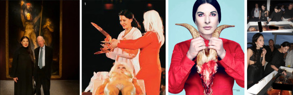 На первой картинке слева Джейкоб Ротшильд и Марина Абрамович на фоне картины "Сатана, призывающий свои легионы", второй кадр из "перформанса" Абрамович из Лос-Анджелеса 2011 года, третий кадр - "Духовная кулинария" , четвертый Абрамович и Гага изображают поедание крови с тела