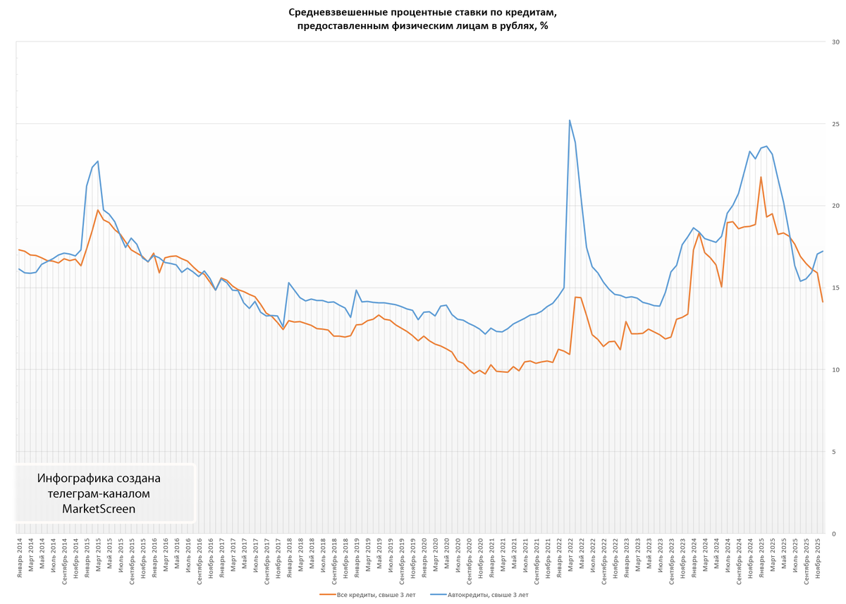 В декабре 2025 продолжили снижение средневзвешенные ставки по кредитам, предоставленным кредитными организациями физическим лицам.