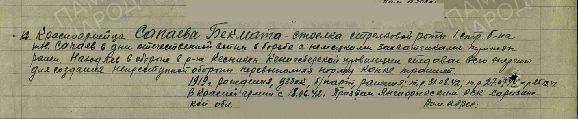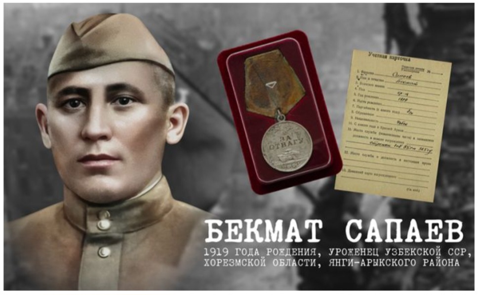 – К сожалению, сын Бекмата Сапаева не дожил до этого события, медаль будет передана его внуку, – рассказал сотрудник представительства агентства миграции при посольстве Республики Узбекистан в России Темурбек Ниязметов в ходе церемонии передачи награды. – Их семья очень трогательно приняла эту новость. Девятого мая мы отмечаем День Памяти и Почести, вспоминаем погибших, рассказываем о них молодёжи. С узбекской стороны на Второй мировой войне было 420 тысяч погибших, более полутора миллионов уроженцев республики приняли участие в боевых действиях на фронтах, 38 наших земляков получили звание Героя Советского Союза за храбрость и подвиги.