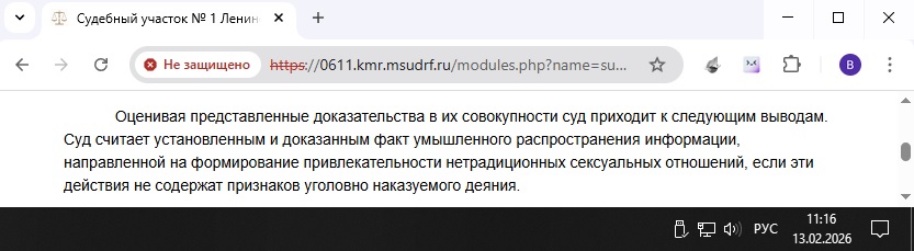 "Оценивая представленные доказательства в их совокупности суд приходит к следующим выводам. Суд считает установленным и доказанным факт умышленного распространения информации, направленной на формирование привлекательности нетрадиционных сексуальных отношений, если эти действия не содержат признаков уголовно наказуемого деяния".