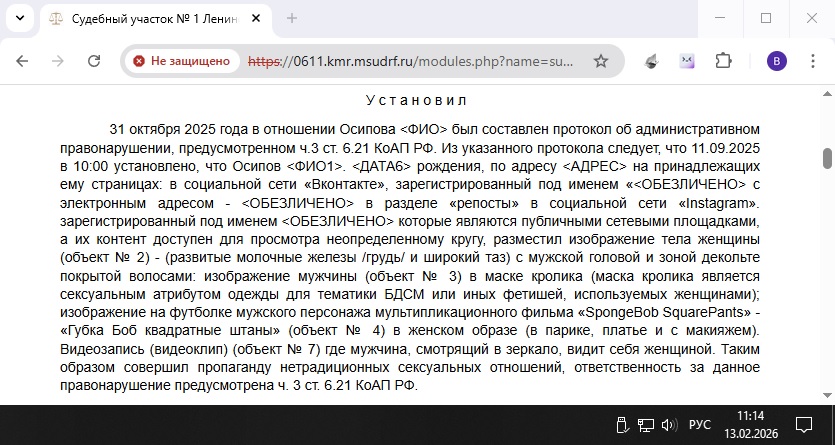 Итак, суд оштрафовал гражданина Осипова не за губку Боба, а за совокупность материалов. Логика прокуратуры и суда заключалась в следующем. Размещение изображения тела женщины с мужской головой и зоной декольте покрытой волосами (1) и публикация видео, где мужчина, смотрящий в зеркало, видит себя женщиной (4), являются нарушением Статьи 6.21 КоАП РФ, а всё остальное лишь подтверждает перверсивные наклонности и пропаганду. Вы лично публикуете подобные материалы? Нет. Нормальный человек делать этого не станет (с оговоркой на контекст).