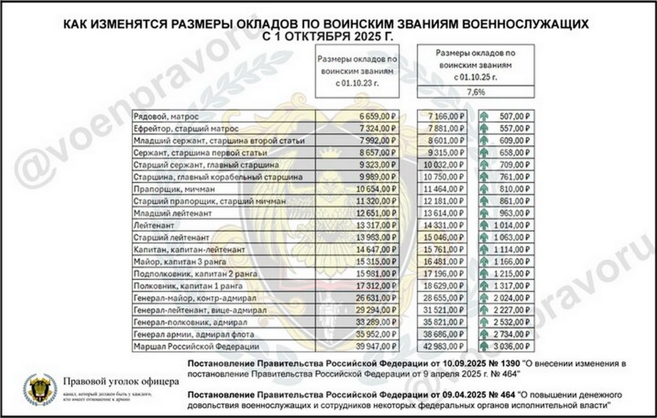 В соответствии с постановлением Правительства Российской Федерации «О повышении денежного довольствия военнослужащих и сотрудников некоторых федеральных органов исполнительной власти» с 1 октября 2025 г.: