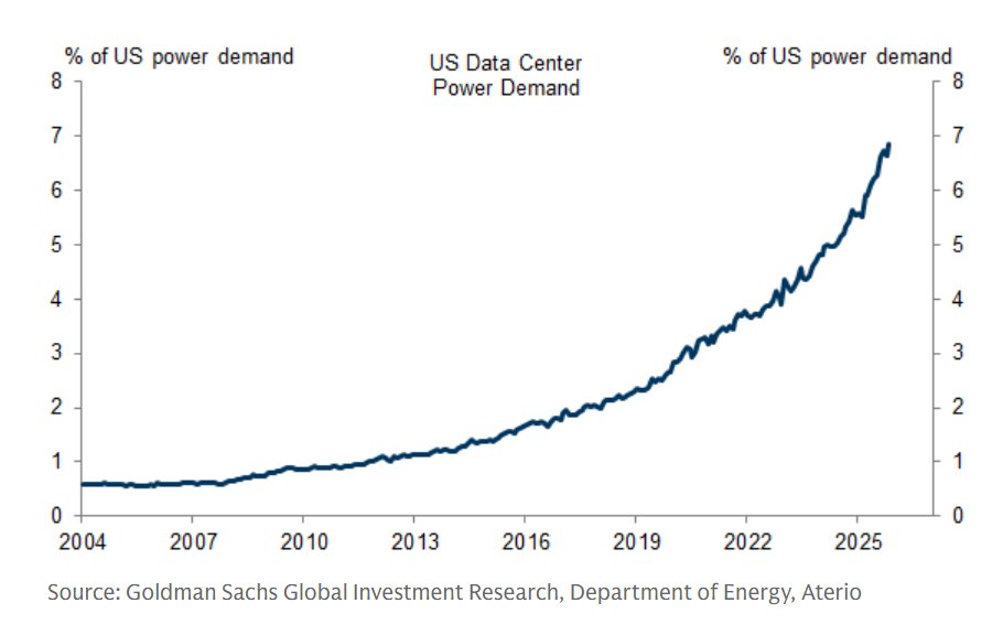 Голдман Саксы сообщают, что спрос на электроэнергию со стороны американских дата-центров составил уже 7% от всего спроса внутри США на электроэнергию.