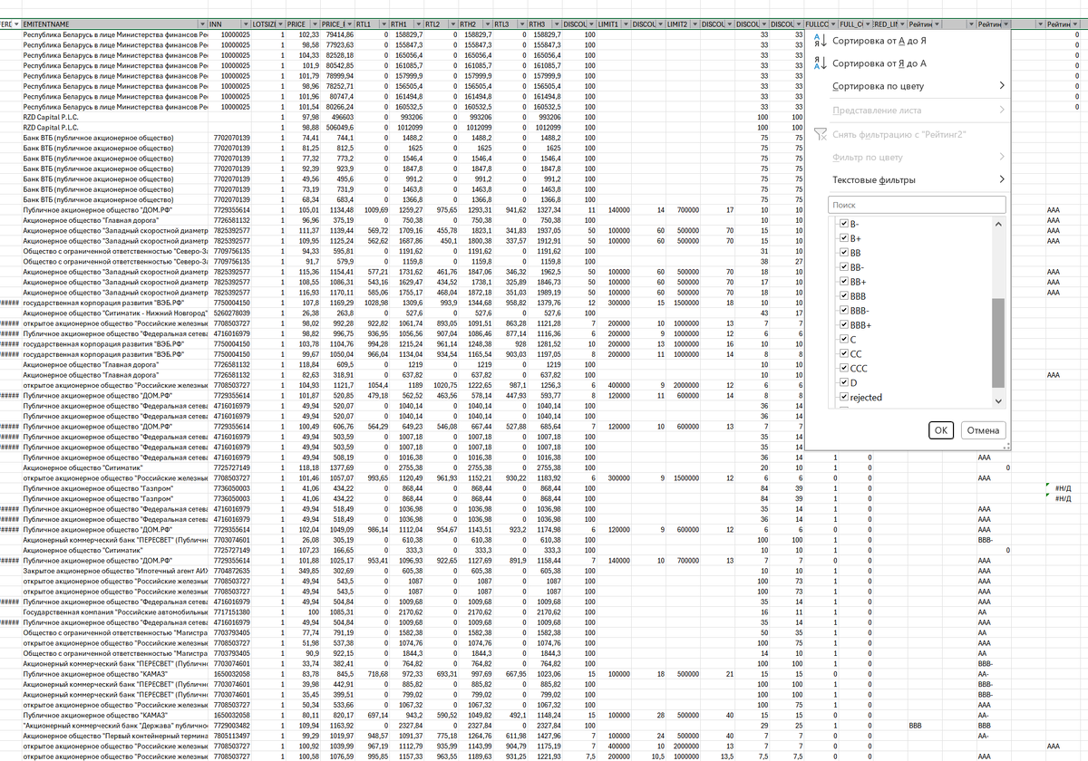 Работаю с массивом выпусков корпоративных облигаций. С разных источников проставили рейтинги в один лист. Не везде получилось, не везде правильно. К примеру, Альфу бьет только по списку Финама, где привязка к выпускам, а выпуски у Альфы «ВВВ», тогда как сам эмитент АА+. Получается отфильтруются. А не хотелось бы.