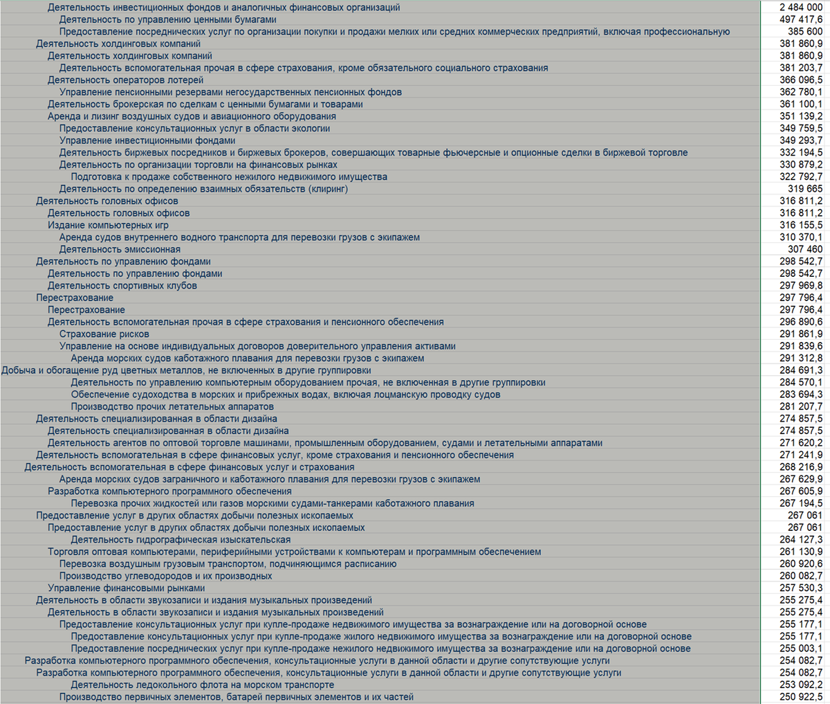 Но если раскрыть 66-й ОКВЭД, то там есть, к примеру, 66.12.2 «Деятельность по управлению ценными бумагами». Так глубоко в сборнике Росстата деятельности не раскрываются. И теперь понятно почему. Потому что там боль! Там, по 66.12.2, цифра 497 417 ₽.