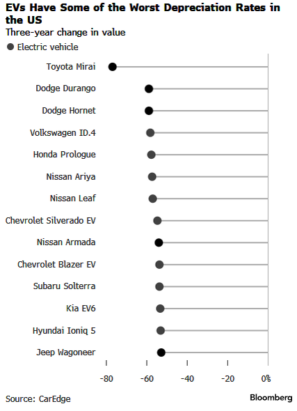 Так вот, тамошние аналитики говорят, что падение цены на электрички двух- или трёхлетней давности составляет порядка 50%. При этом на машине продолжает действовать полная гарантия.