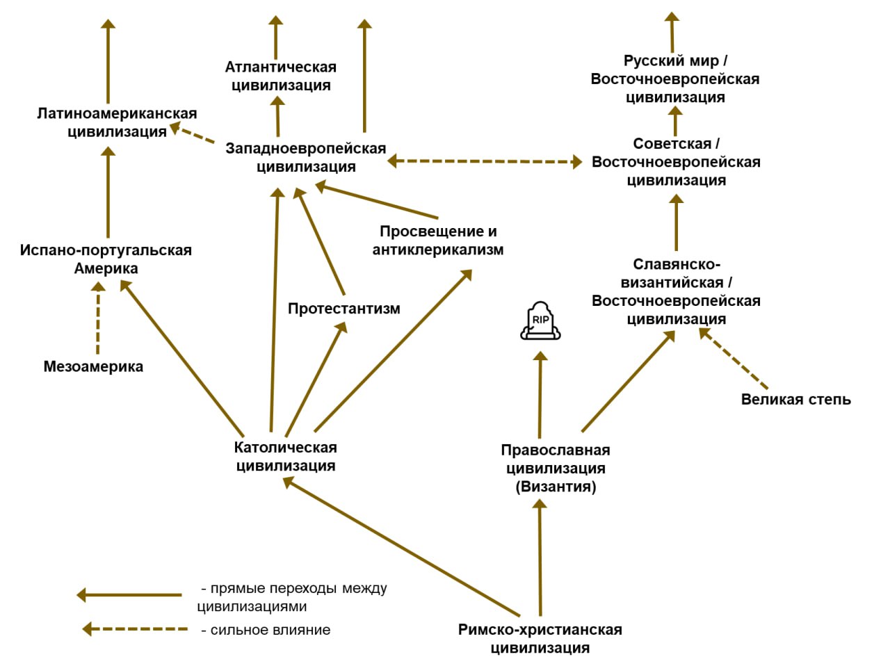 Небольшая иллюстрация генезиса куста европейских цивилизаций последних полутора тысяч лет. Вопросы Греции, Рима и т.д. из более ранних времен тут не рассматриваем. На схеме хорошо видно всё большее расхождение и уход от общего корня. Показаны только основные влияния.
