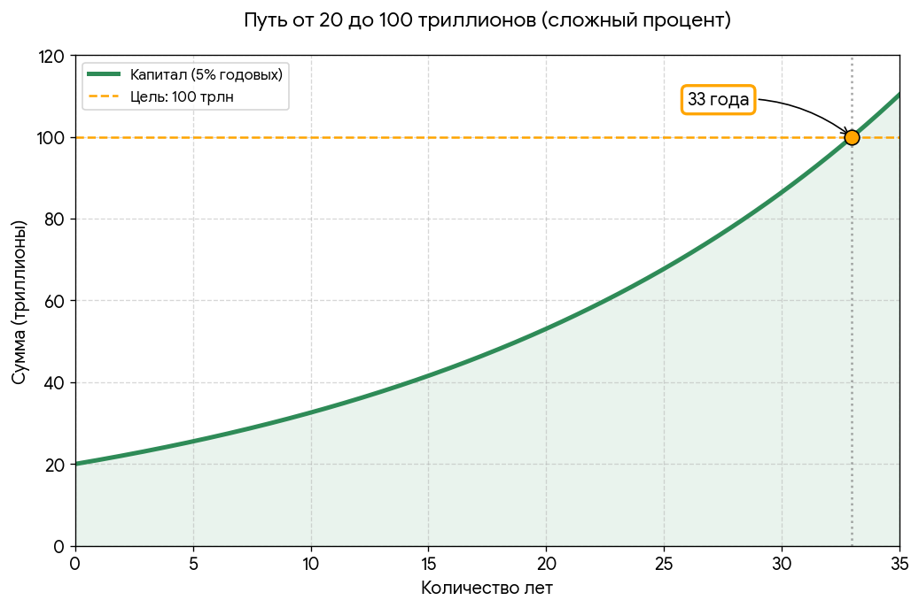 Сложный процент показывает что всего через 33 года ВВП составит 100 триллионов если ежегодный рост бдет 5%