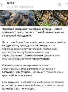 Новость первая. Черепахи совершают массовый суицид - самки прыгают со скал, спасаясь от сексуально озабоченных самцов. Половые органы в хлам. Патриархат добрался и до рептилий.