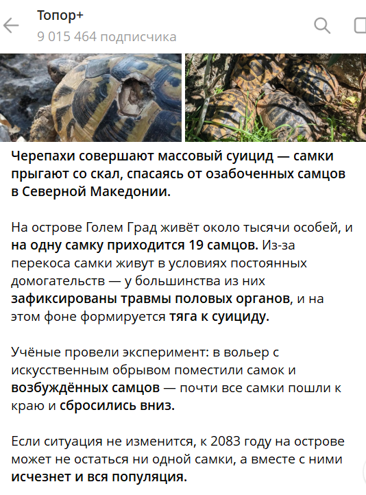 Целевая аудитория - женская массовка, реакция предсказуемая. Но давайте по существу. Формулировка «массовый суицид» применительно к черепахам - это намеренное упрощение и чистый антропоморфизм. У рептилий нет неокортекса. Приписывать им осознанное намерение умереть - это не популяризация науки, это манипуляция. Наука объясняет их поведение иначе: инстинктивное избегание угрозы, стрессовая реакция, попытка спастись. Если бегство заканчивается падением со скалы - это трагичный побочный эффект стратегии выживания, а не экзистенциальный выбор. Говорить здесь нужно о демографическом дисбалансе в популяции и поведенческих реакциях на хронический стресс - но это скучно и не вызывает нужных эмоций.
