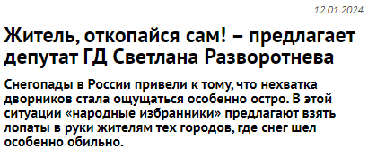 В Агенстве новостей "Строительный бизнес" есть статья от 2024 года " Житель, откопайся сам! – предлагает депутат ГД Светлана Разворотнева". ТО есть идея давняя. Пусть житель платит и убирает сам, моет лестницу сам, топит сам, ловит преступников сам, лечится сам. А им - руководителям - только деньги, а заботы жителям.