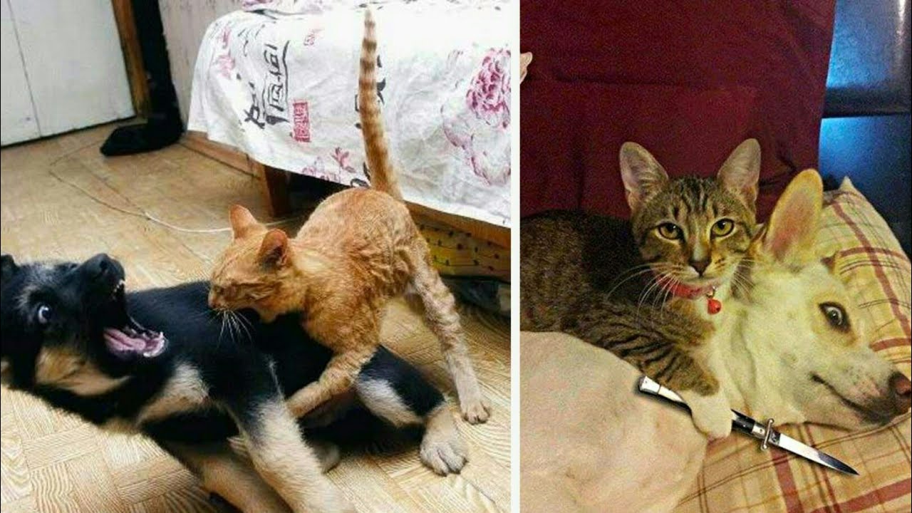Тоже попадались такие видео, кажется, что собаки просто поддаются, потому что псине один раз пасть открыть, обхватить кота поперек и закрыть - и все. Это удивляет.