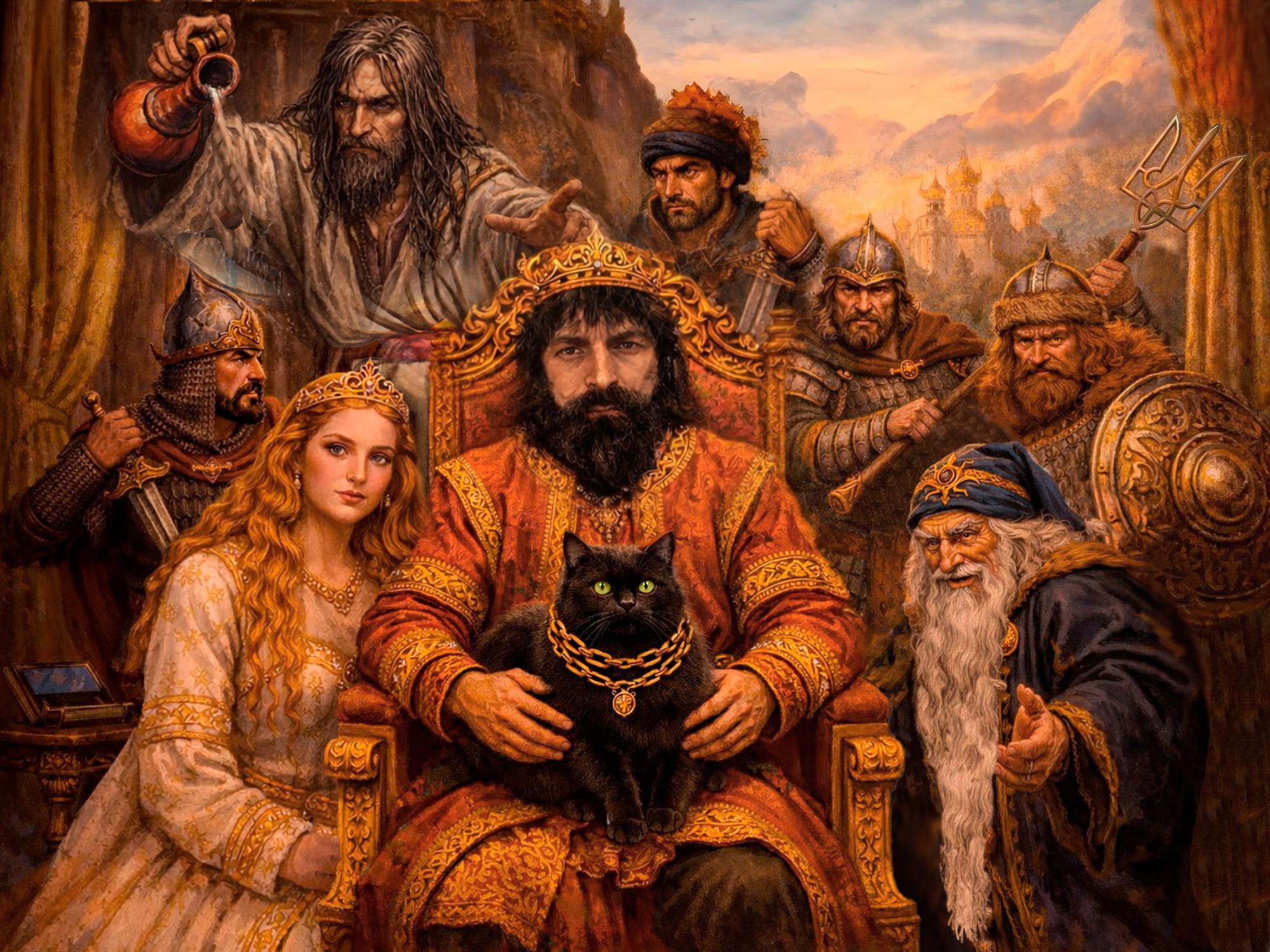 Вот только о якобы героических подвигах Руслана мы, люди, можем узнать только из сказки кота-вруна, и потому по жизни хромающего на оба колена, а внутри сказки – от самого Руслана, а ещё от Рогдая, Фарлафа, Ротмира и Финна. Все кроме Руслана – уже сформировавшиеся колдуны. Ротмир и Финн – действующие коты. А Руслан под каблуком Людмилы обязательно скатится к тому же. Словом, не просто одна групповуха, но и одна управляющая компания.
