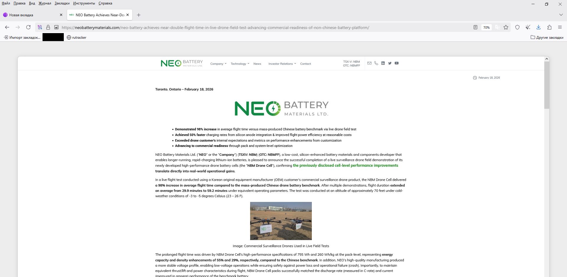 Канадская NEO Battery Materials показала на полевых испытаниях, что батарея с кремниевым анодом способна почти удвоить время полёта коммерческого дрона без переделки самого аппарата. Компания из Ванкувера сравнила свой комплект NBM Drone Cell с массовой китайской батареей и получила 98% прирост средней продолжительности полёта: с 29,9 до 59,2 минуты при одинаковых режимах работы.