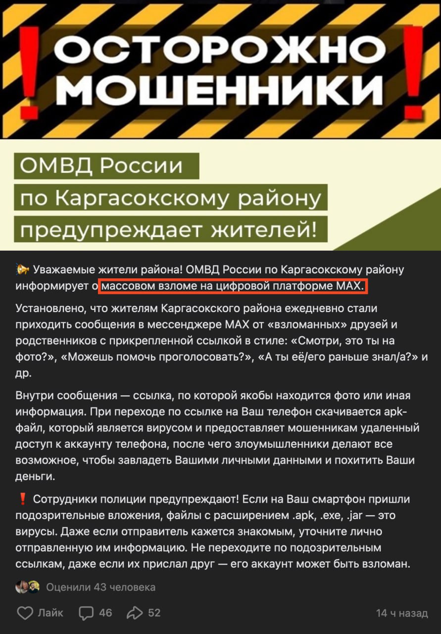 взломали не сам мессенджер, а аккаунты долбодятлов, которые пренебрегли нормами безопасности, не установили пароль для входа в МАКС, и не ввели адрес своей электронной почты, а потом сообщили код для входа из СМС мошенникам.
